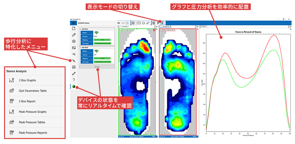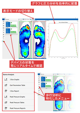 - 力の推移をグラフ表示し、足の機能の対称性やタイミング評価