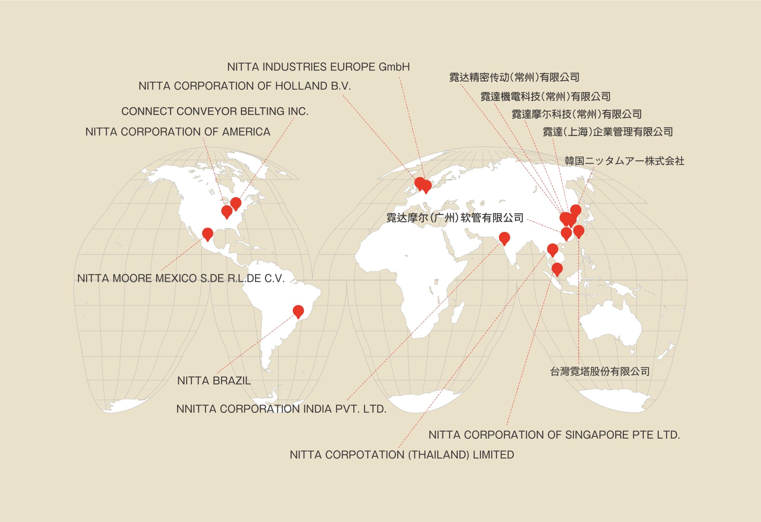 本格的にグローバル活動を始めたのは、およそ50年前の1968(昭和43)年、アメリカ企業と合弁でニッタ・ムアーカンパニーを設立したことが始まりです(現在はニッタ・ムアー事業部)。その後、欧米やアジアに、相次いで現地子会社を設立したり、現地企業との合弁企業を設立したりと、活動を広げてきました。